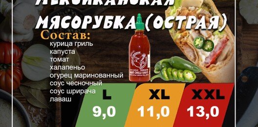 Курица гриль, пепперони, капуста, огурец маринованный, остро-сладкий соус, чесночный соус, томат, лаваш