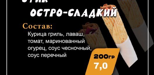 Курица гриль, лаваш, томат, маринованный огурец, соус чесночный, соус сырный, соус кисло-сладкий